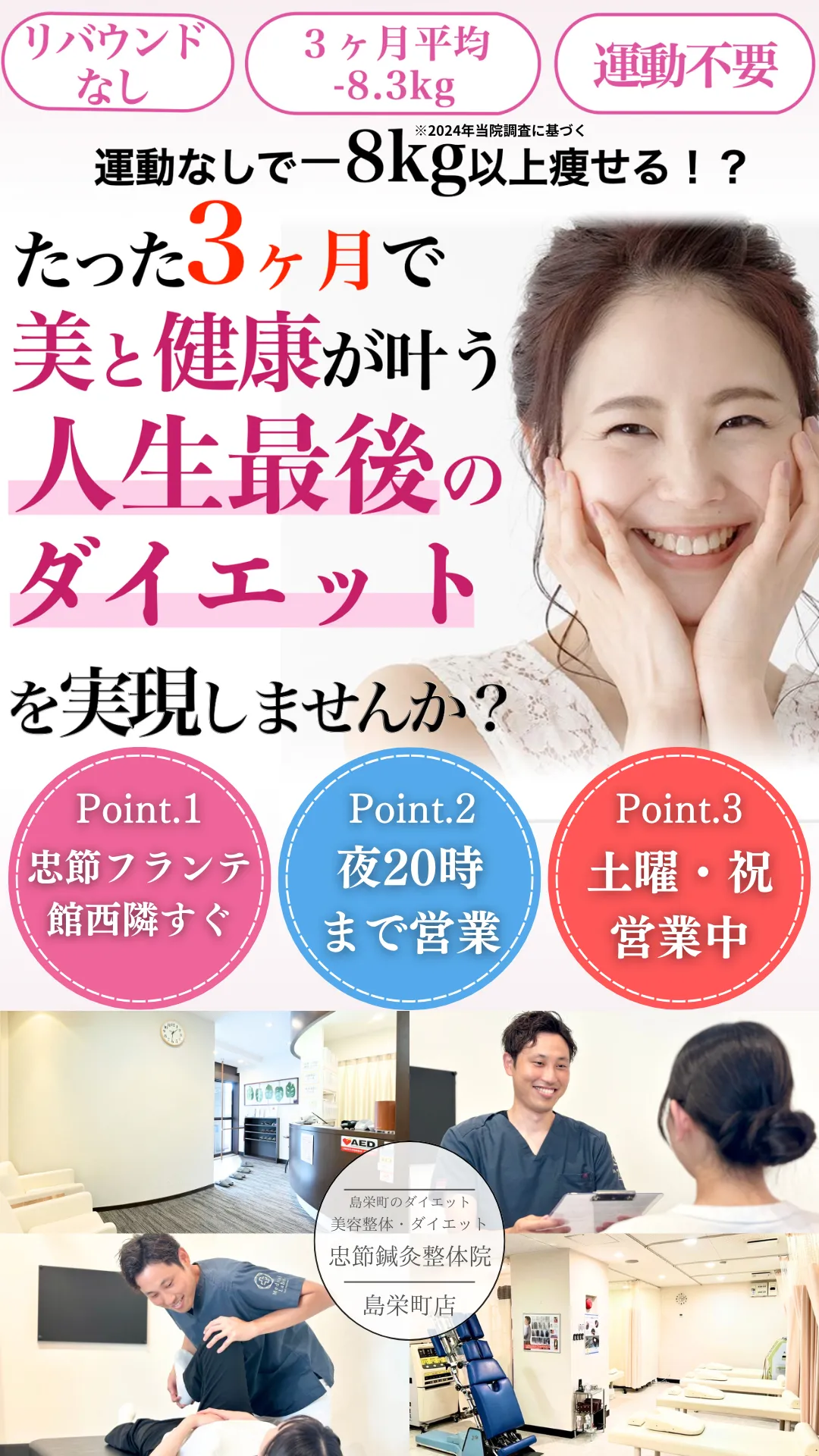 ダイエットのプロとしての証である資格を保有し、数多くのお客様から支持され、あなたの悩みに真正面から向き合う、忠節鍼灸整体院に来院し、健康と美容の先にある理想の自分を叶えて心から思いっきり楽しめる人生を手に入れる道。